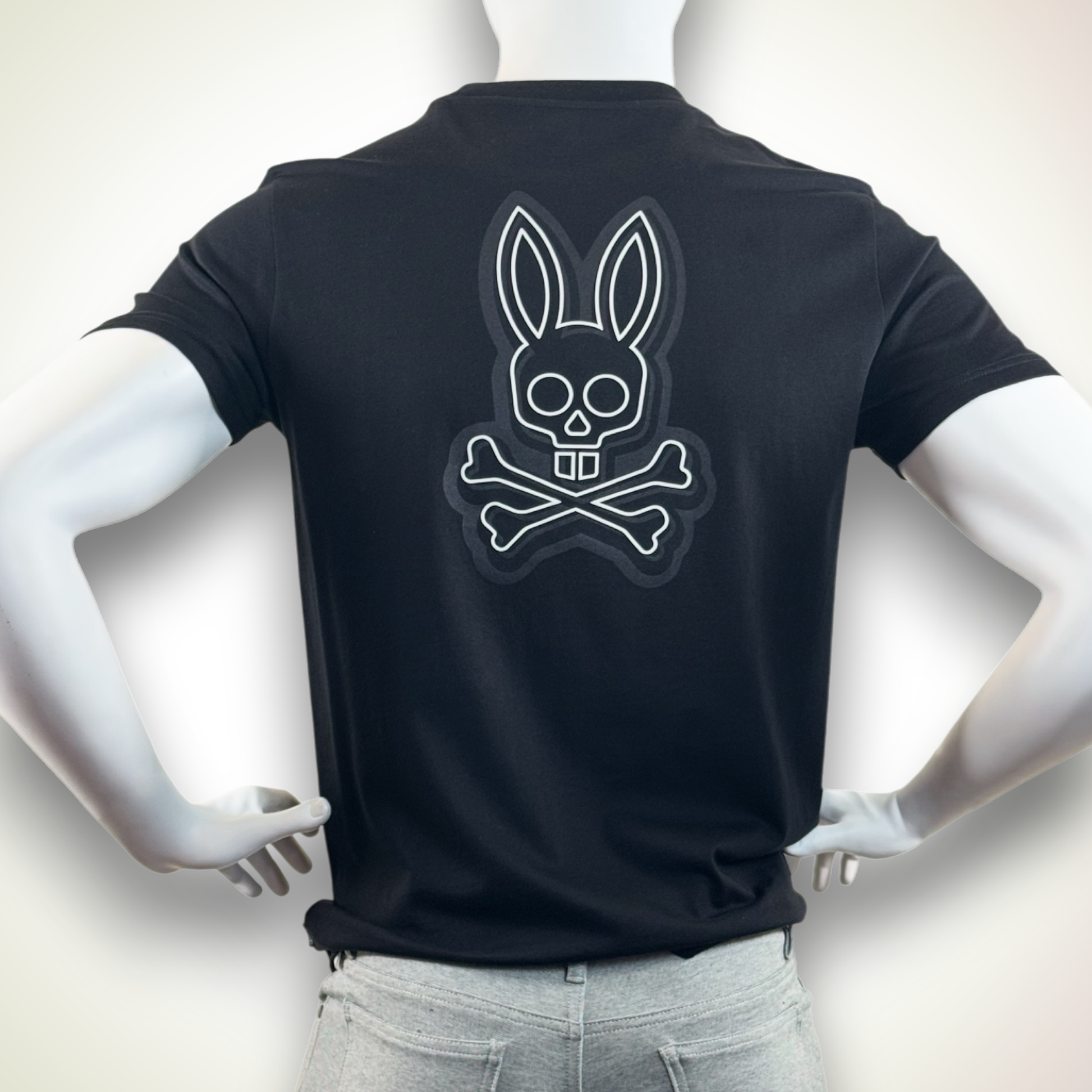 100% Pima cotton, black graphic tee from Psycho Bunny. White Psycho Bunny logotype on front over the left chest, larger bunny logo on the back.